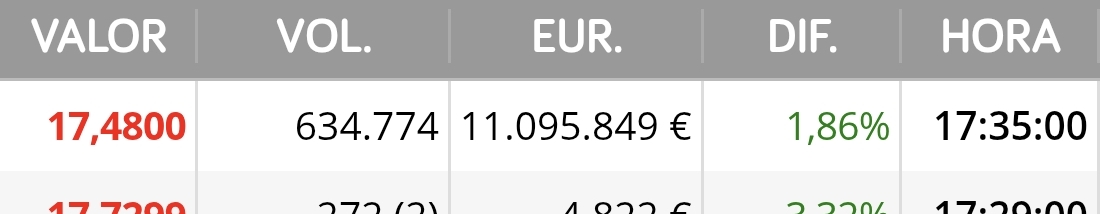 No creo que tarden mucho en concretar las condiciones del acuerdo, mucho volumen sobre todo a la venta para mantener el precio rondando los 17.5 igual que cerró el pasado jueves.